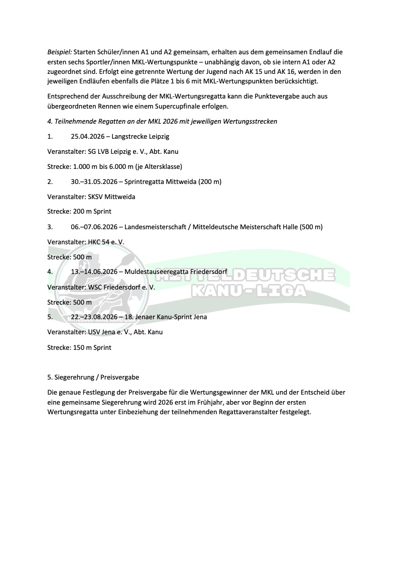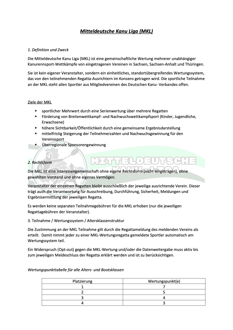 Die Mitteldeutsche Kanu Liga (MKL) ist eine gemeinsame Serienwertung über mehrere Kanurennsport-Regatten in Sachsen, Sachsen-Anhalt und Thüringen. Die Teilnahme steht Sportlerinnen und Sportlern aus Mitgliedsvereinen des Deutschen Kanu-Verbandes (DKV) offen. Pro Regatta geht eine spezifische Distanz (200m, 500m oder Langstrecke) in die Wertung jedes im K1 oder C1 Sportlers ein.